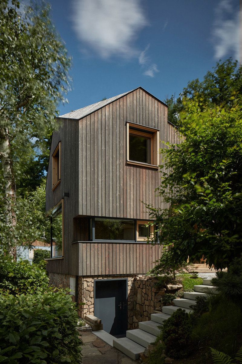 Návrh domu a interiéru probíhal "ruku v ruce" – současně – tak, abychom dokázali dobře využít každý centimetr místa, který nám původní dědova chatička vymezila. S klientem jsme velmi intenzivně komunikovali každý detail a jeho potřeby a očekávání. Patro jsme například vymýšleli "naruby", než jak je zvykem. Nejdříve vznikaly potřebné prostory pro ložnice a pak jsem střechu "okrajovala" tak, aby hmota domu byla co nejmenší. Mým cílem bylo navrhnout stavbu, která se pokorně zapojí do zeleného svahu nad vodní hladinou, kde stojí převážně menší staré chatky.