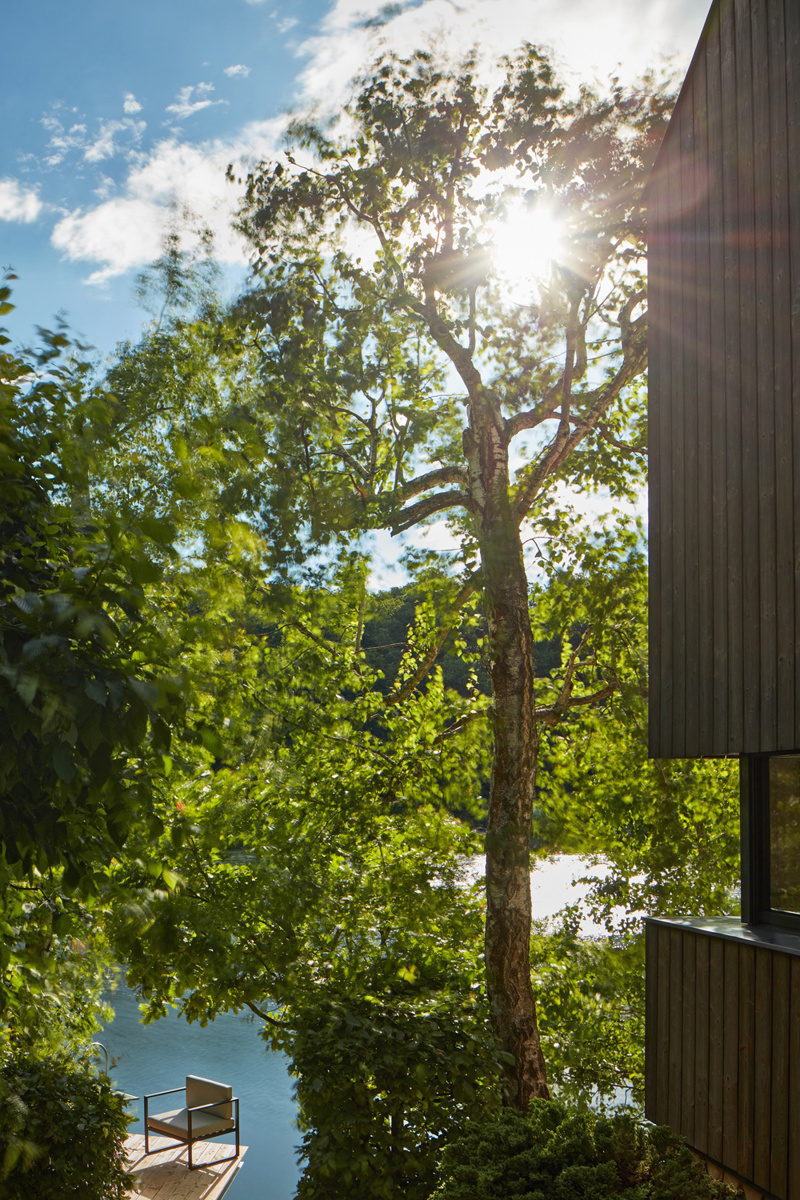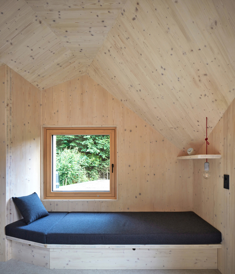 Interiér domu je propojený, zároveň ale podkroví poskytuje dostatek soukromí. Smrkové dřevo uvnitř zajišťuje útulné útočiště a velké prosklené plochy pak dechberoucí výhled na vodní hladinu. Dřevostavba nabízí zázemí rodině majitele, ale i návštěvám. Poskytuje dostatek prostoru k večernímu posezení i spánku. V každém koutě domu se skrývají nenápadné úložné prostory, každá věc má své místo - stejně jako v kajutě lodi.
