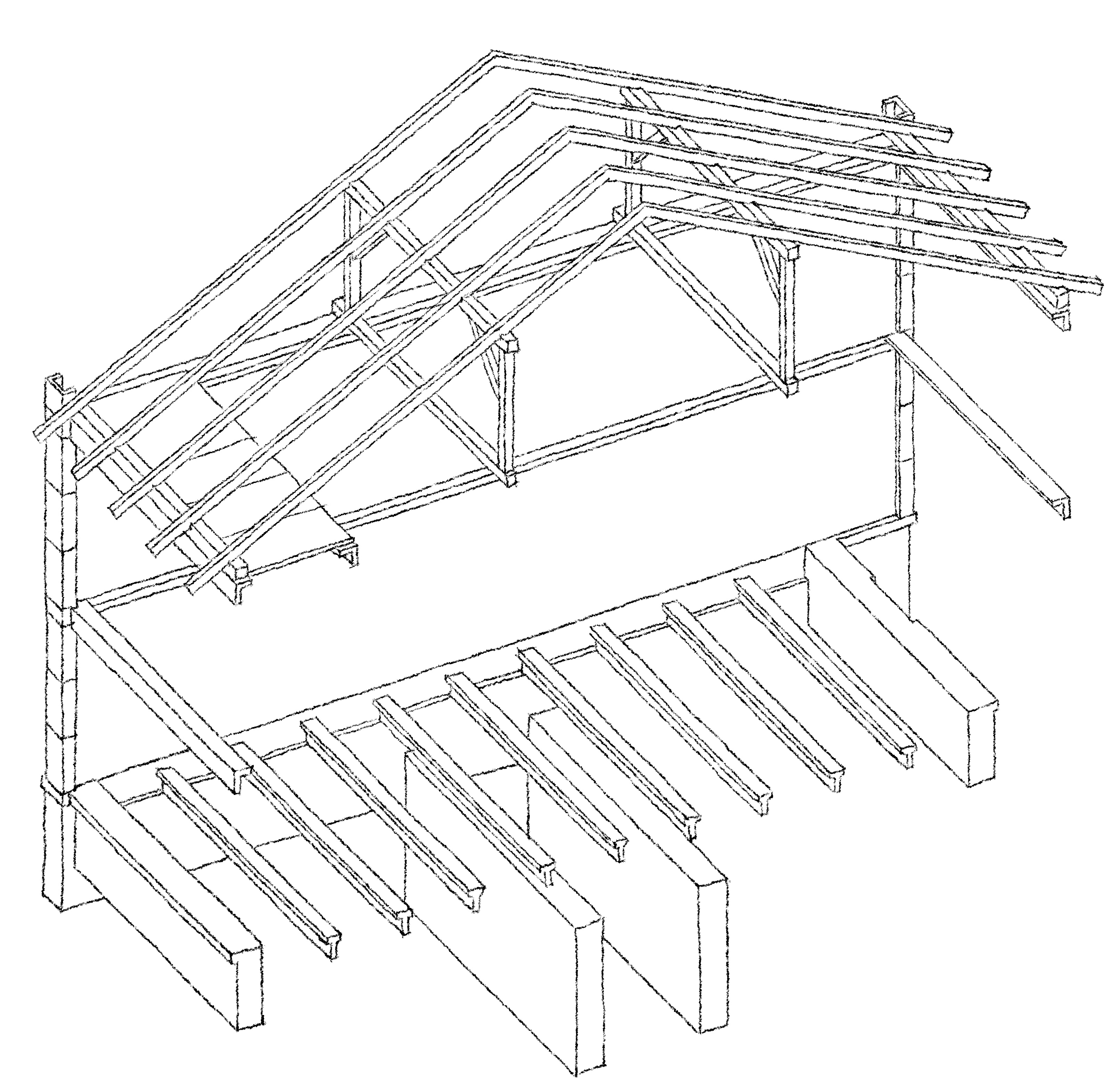 Krov je klasický dřevěný, krokve jsou v polovině délky podepřeny dřevěným rámem, jehož spodní trám je uložen na betonovém věnci nosné stěny. Tento trám se výškově nachází nad úrovní podlahy a pokud má dojít ke zobytnění podkroví, vzniká většinou požadavek umístit ho níže, do úrovně stropní konstrukce. Dřevěné sloupy rámu pak nutné prodloužit, např. přeplátováním.