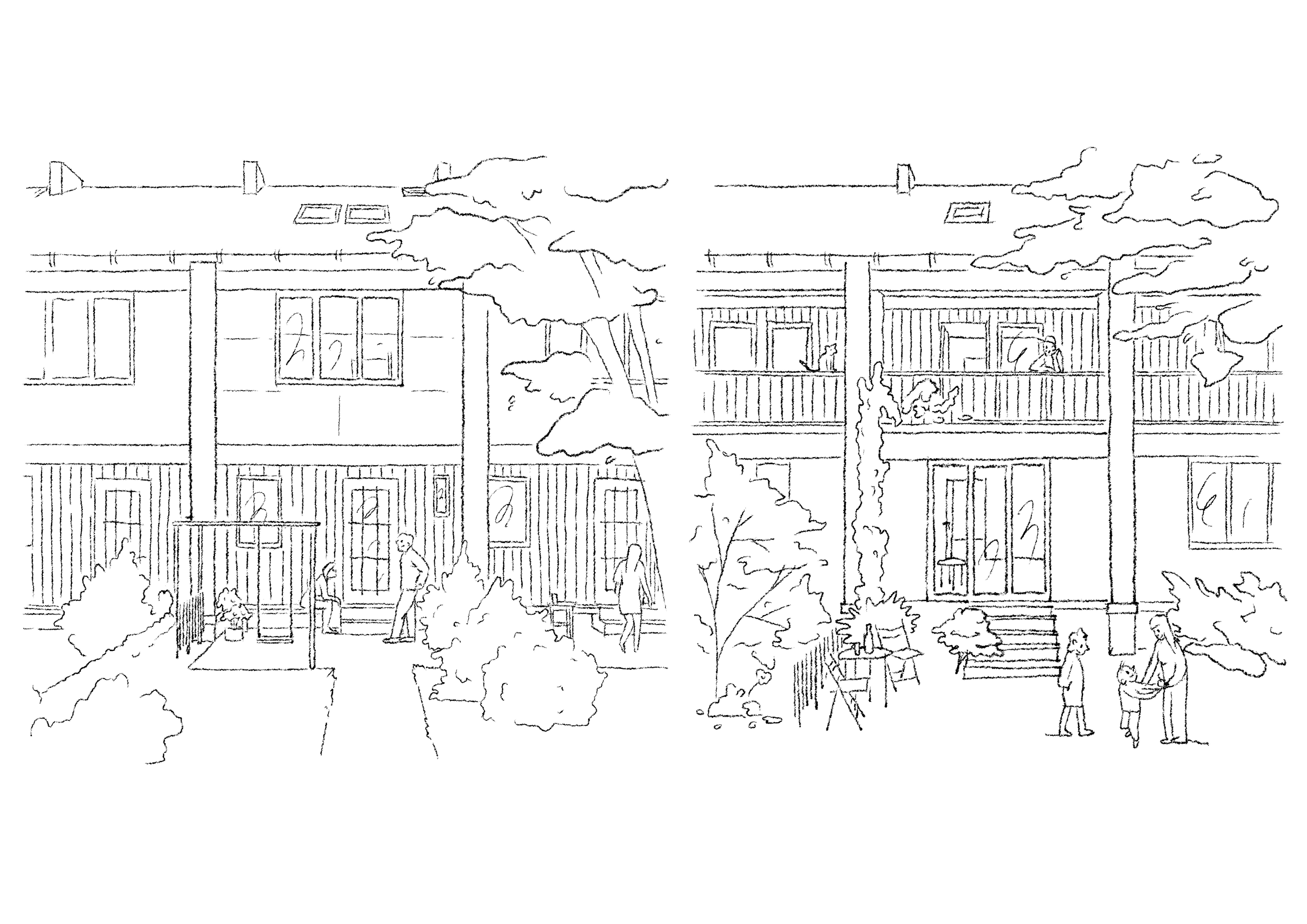 Zpracování vstupů a míra zapuštení zápraží reaguje do jisté míry na aktuální potřeby jednotlivch obyvatel, jednotná trojdílná okna dodávají v kontrastu s tím řadě/bytovému domu jako celku klid a harmonii.