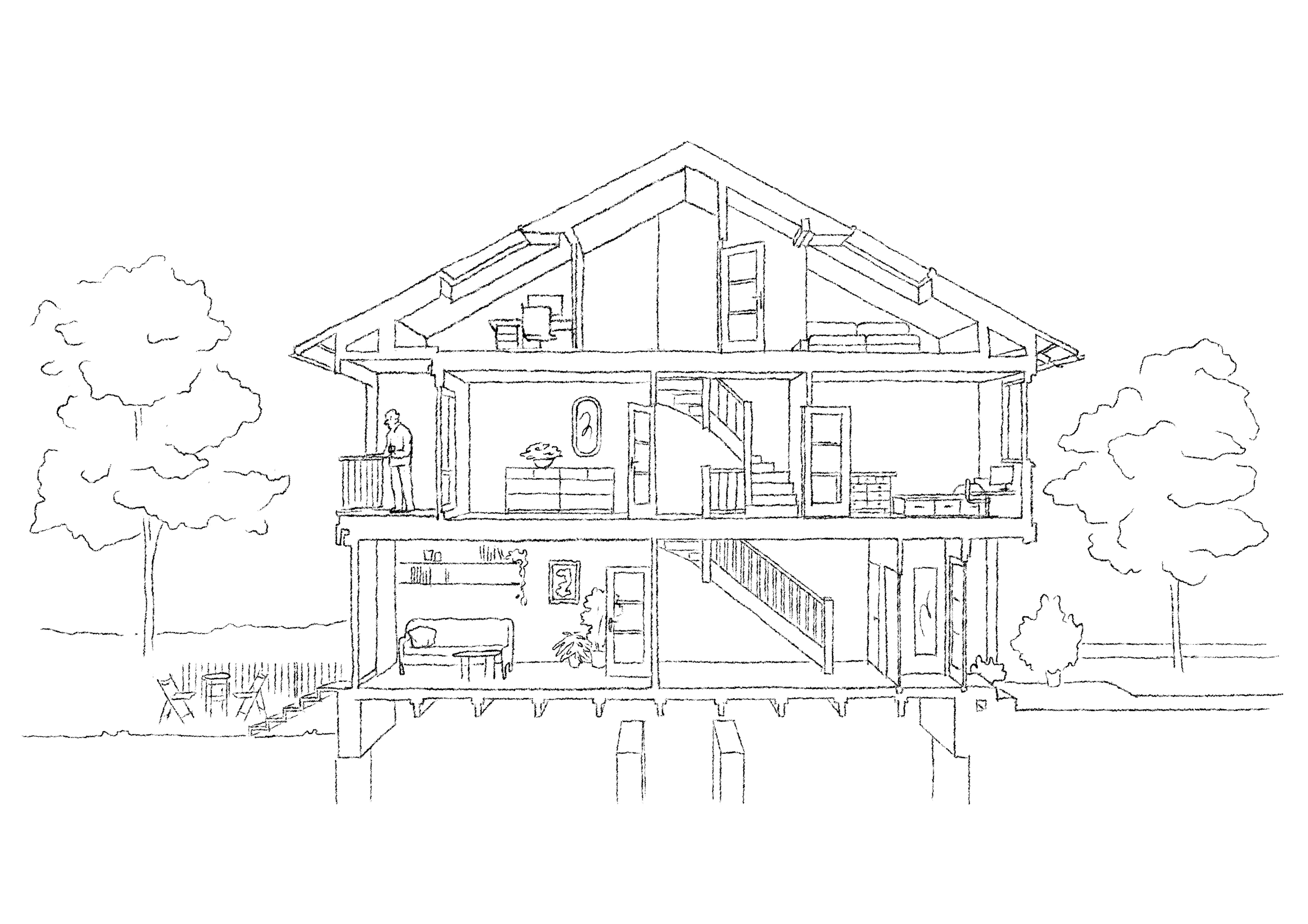 Zapuštěnému vstupu a lodžii naopak propůjčují jemnější měřítko drážkovaná omítka a úzké modřínové palubky. Autoři, tehdy inspirovaní architekturou Skandinávie, použili na fasádách, v jejichž blízkosti se pohybujeme, materiál příjemný na pohled i dotek. Dřevěný obklad na svislo je typický pro architekturu poloviny století, tzv. "mid-century modern", a to v exteriéru i interiéru. Architektura a design této doby je nadčasový a dodnes populární.