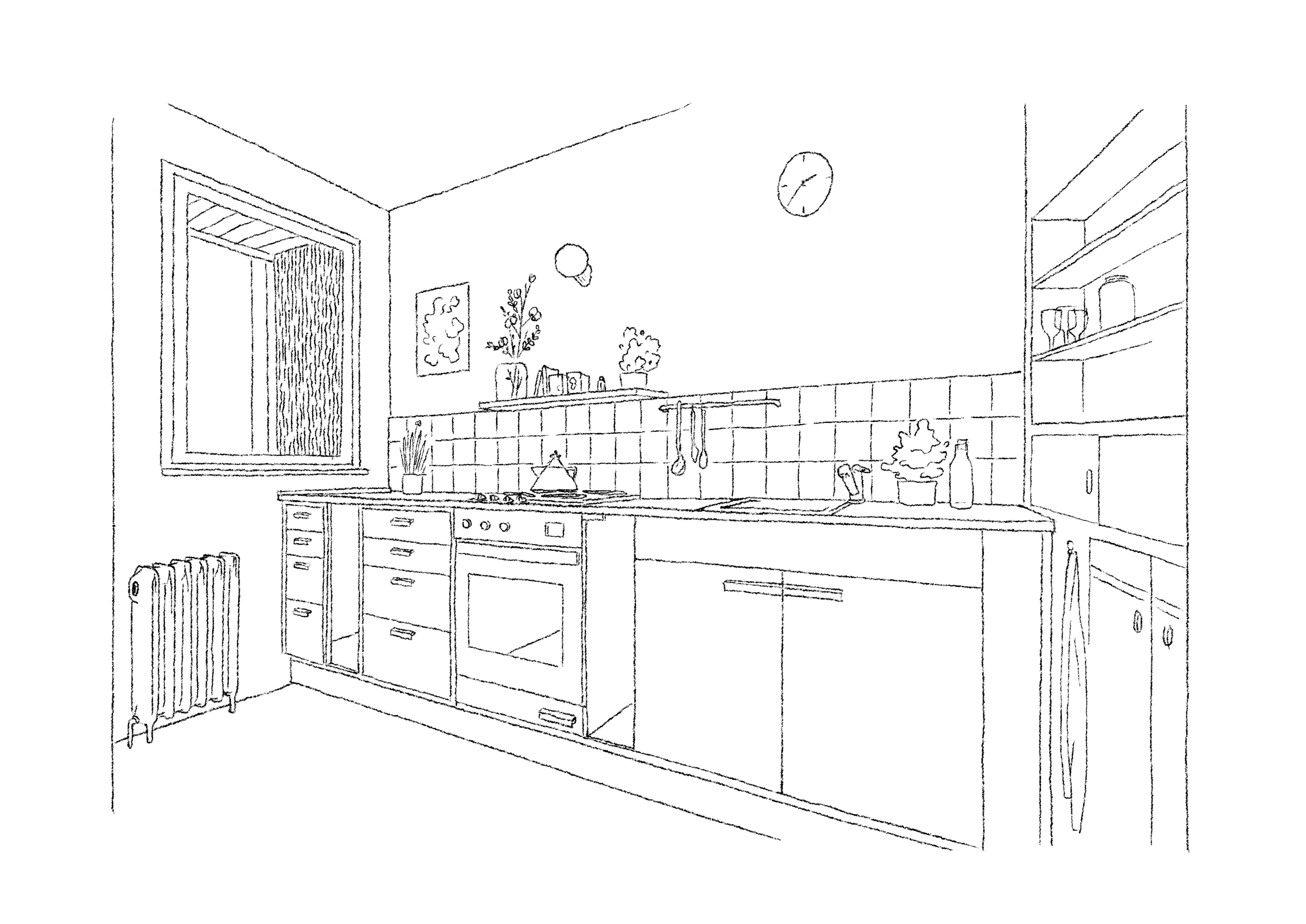 Rozvržení kuchyně bylo z dnešního pohledu překvapivě moderní (i to ukazuje na inspiraci mid-century modern, Skandinávie, Amerika). Žádné horní skřínky, objem úložného prostoru dokonale ukryt ve vestavěném nábytku/kredenci, pokrývající celou stěnu protilehlou oknu. Kuchyně bez horních skříněk působí mnohem vzdušněji a s otevřenými policemi či obrazy na stěně výrazně více připomíná obytnou místnost. K tomuto konceptu se nyní po desítkách let návrhy kuchyní vrací - objem úložného prostoru je koncentrován do několika vysokých skříněk a v okolí pracovní desky je kladený důraz na vzdušnost, přehlednost, přívětivost - tak aby zde bylo příjemné pracovat.