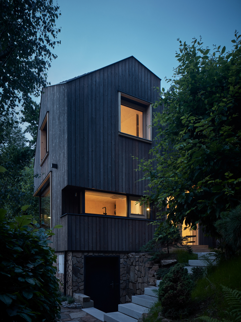 Dřevostavba nabízí zázemí rodině majitele, ale i návštěvám. Poskytuje dostatek prostoru k večernímu posezení i spánku. V každém koutě domu se skrývají nenápadné úložné prostory, každá věc má své místo - stejně jako v kajutě lodi.